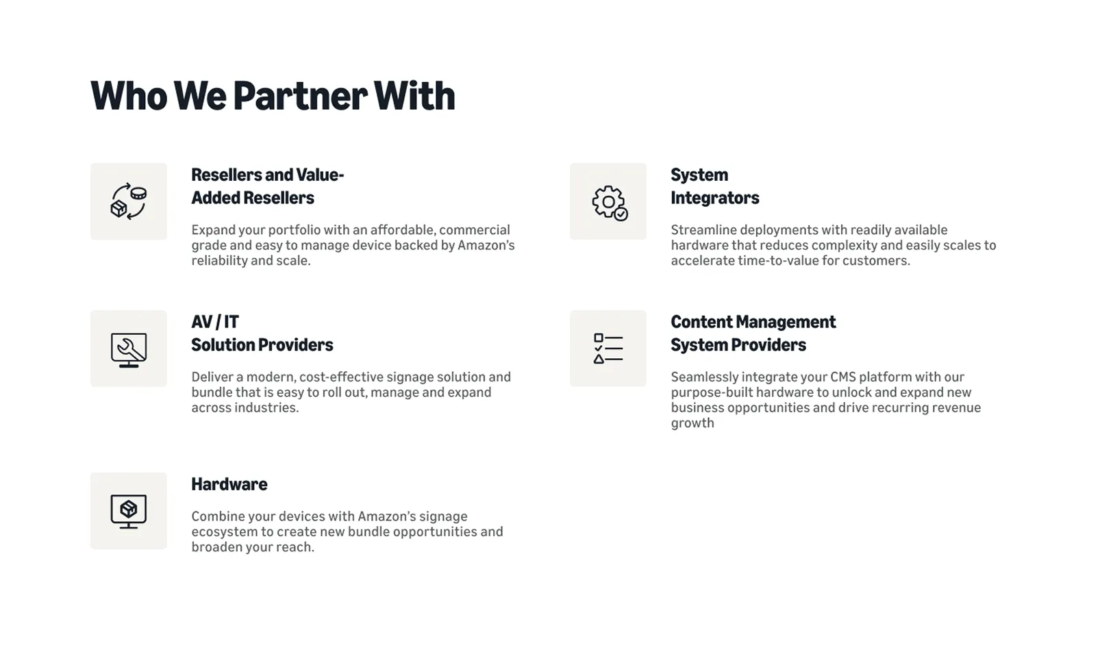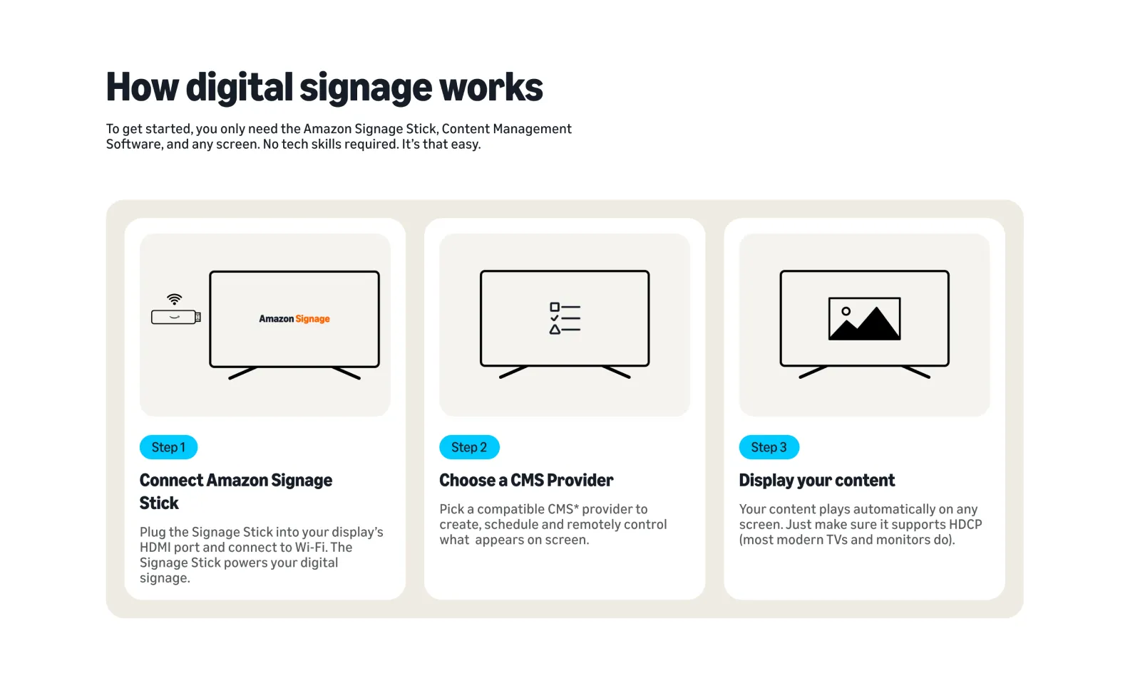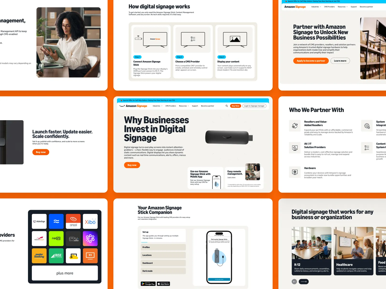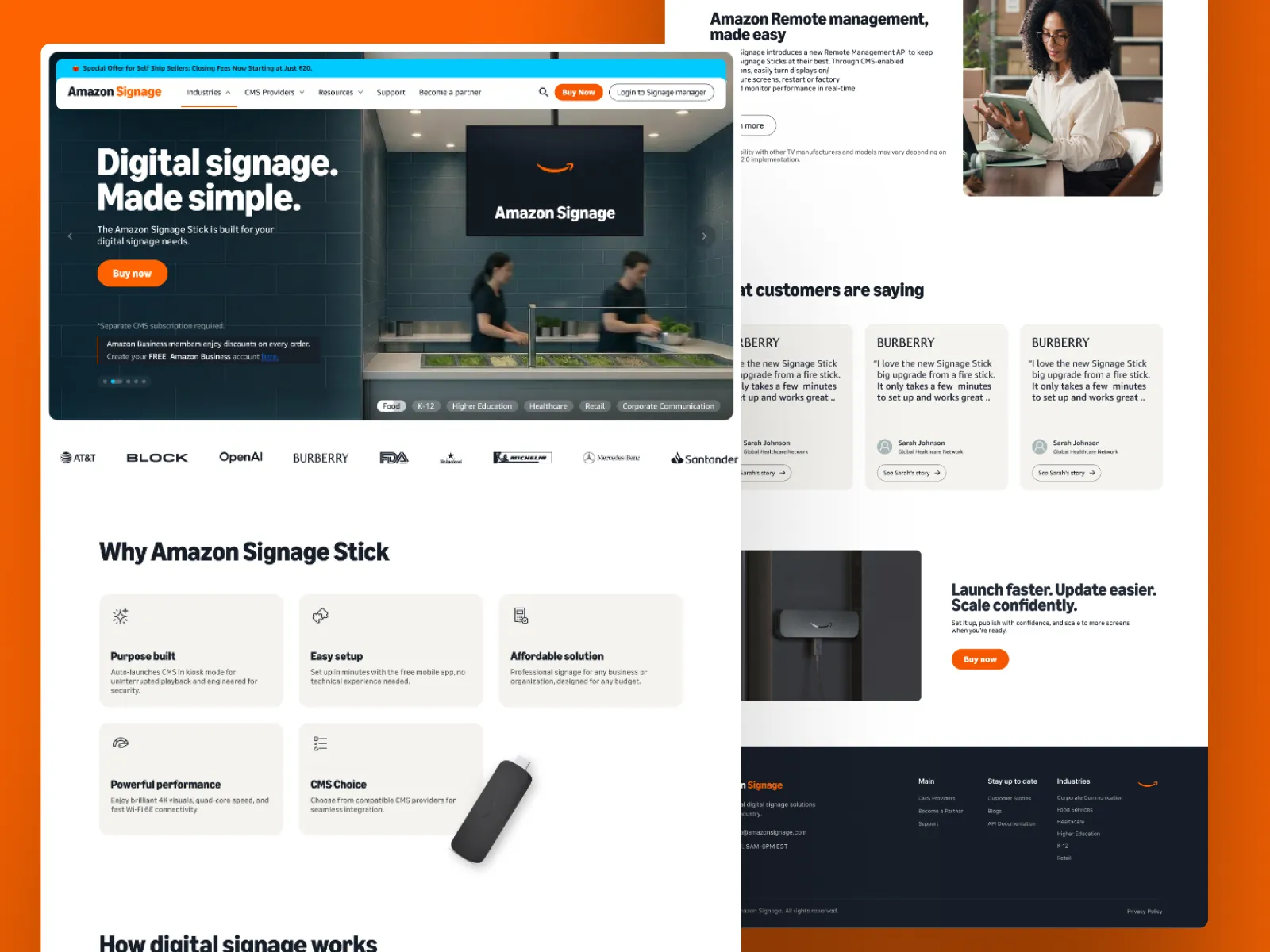 The result is a site that makes a technical hardware product feel approachable. Anyone landing on signage.amazon.com can understand what the Signage Stick does, who it's for, and how to get started, in under a minute. With a CMS-driven build, Amazon's team can scale the site independently as the product grows into new markets and industries.