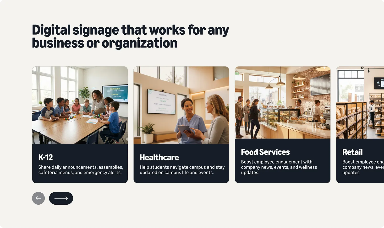 Amazon Signage needed a website that explained a brand-new product, the Amazon Signage Stick, in the simplest way possible. The product serves schools, hospitals, restaurants, retailers, and corporations, so the site had to speak to very different audiences without feeling complicated. The brand direction and design system were already in place. Our job was to build it in Webflow, fast, responsive, and easy to manage going forward.