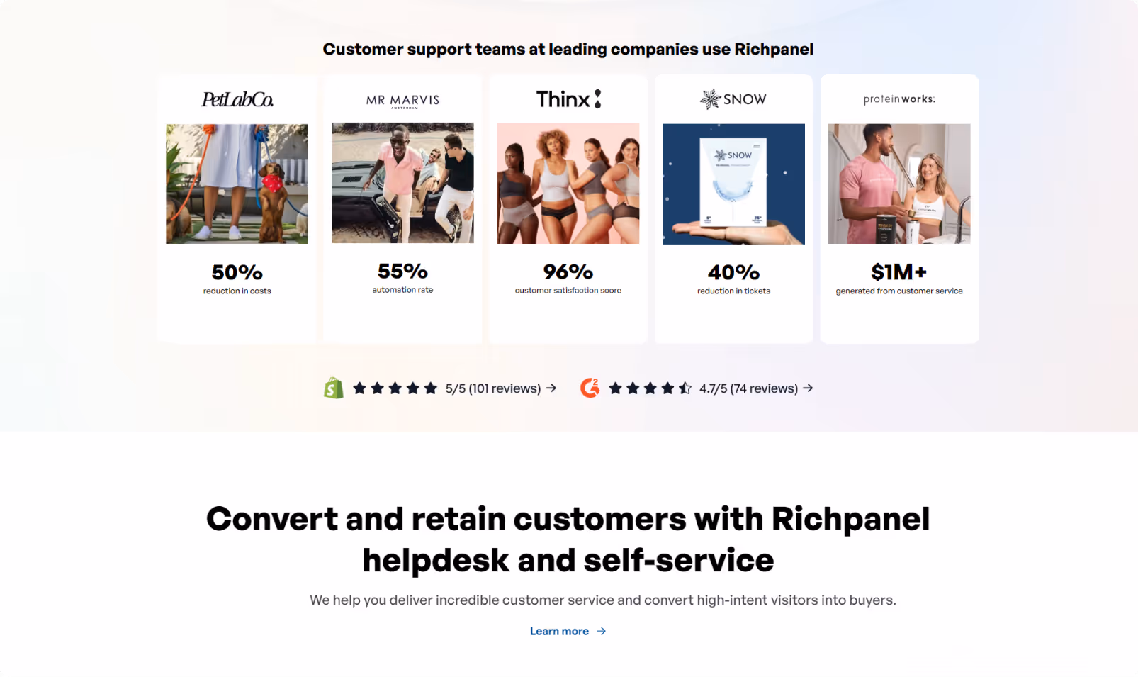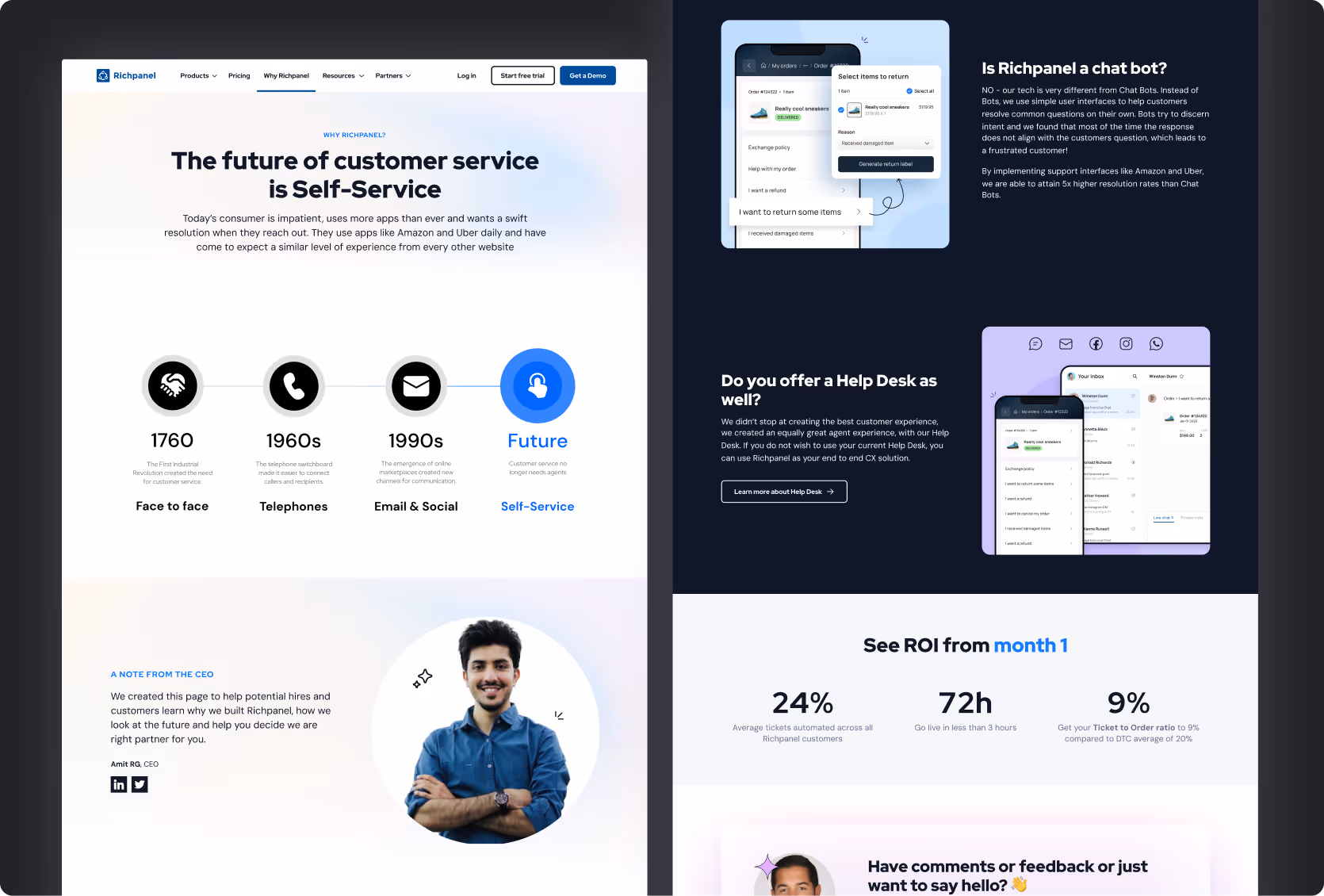 We designed and developed Richpanel’s Webflow website to mirror the brand’s promise, reducing support costs, automating resolutions, and transforming how e-commerce teams deliver customer care.
