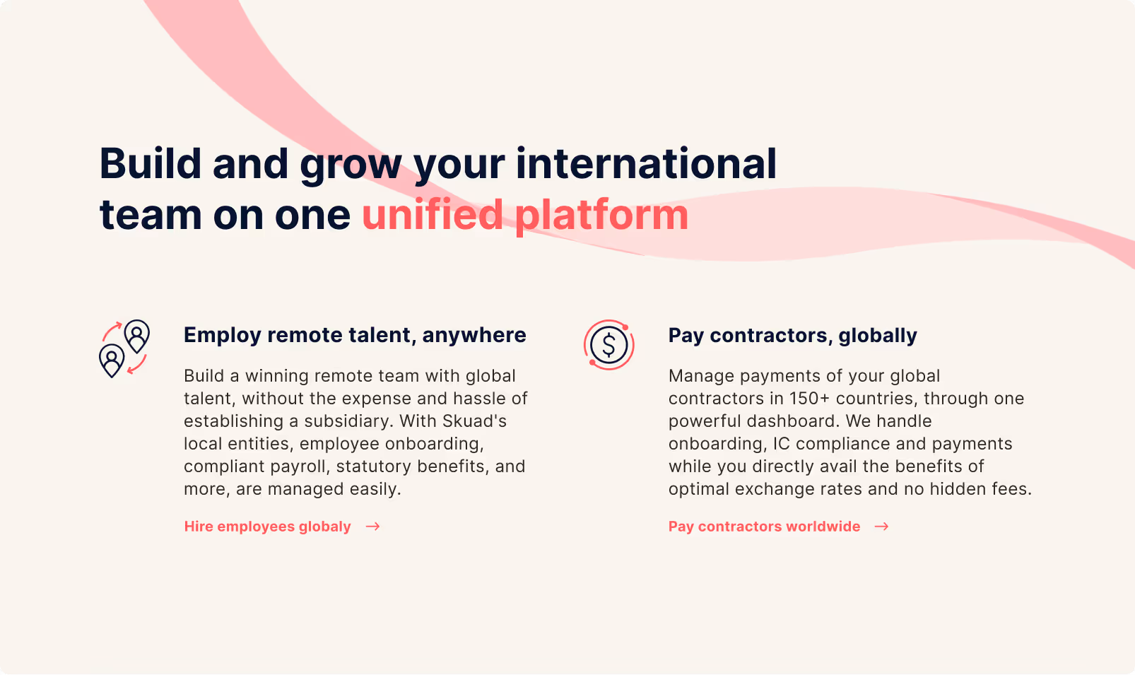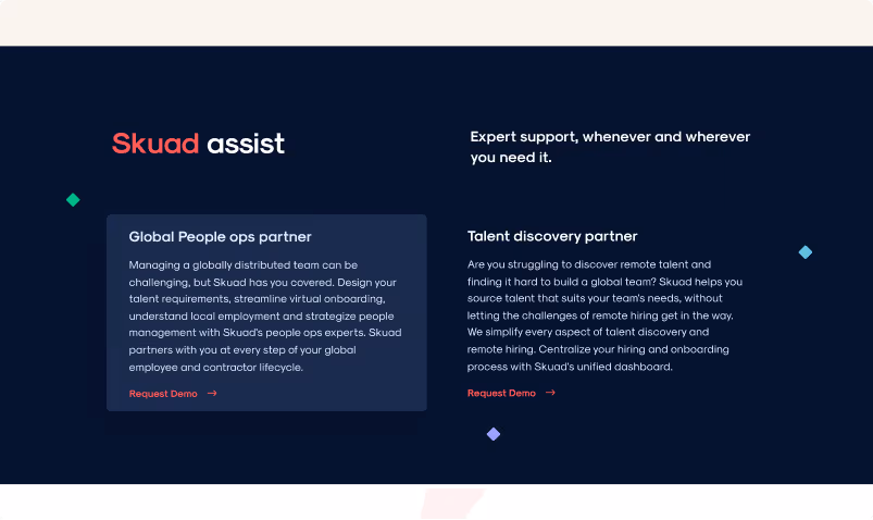 The website we built allows Skuad to communicate their mission clearly, making global employment simple, compliant, and scalable. By presenting onboarding, payroll, compliance, and benefits in a clear and engaging way, the site demonstrates how complex HR operations can be simple, efficient, and human-centered. The digital experience reinforces trust, highlights expertise, and positions Skuad as a reliable partner.