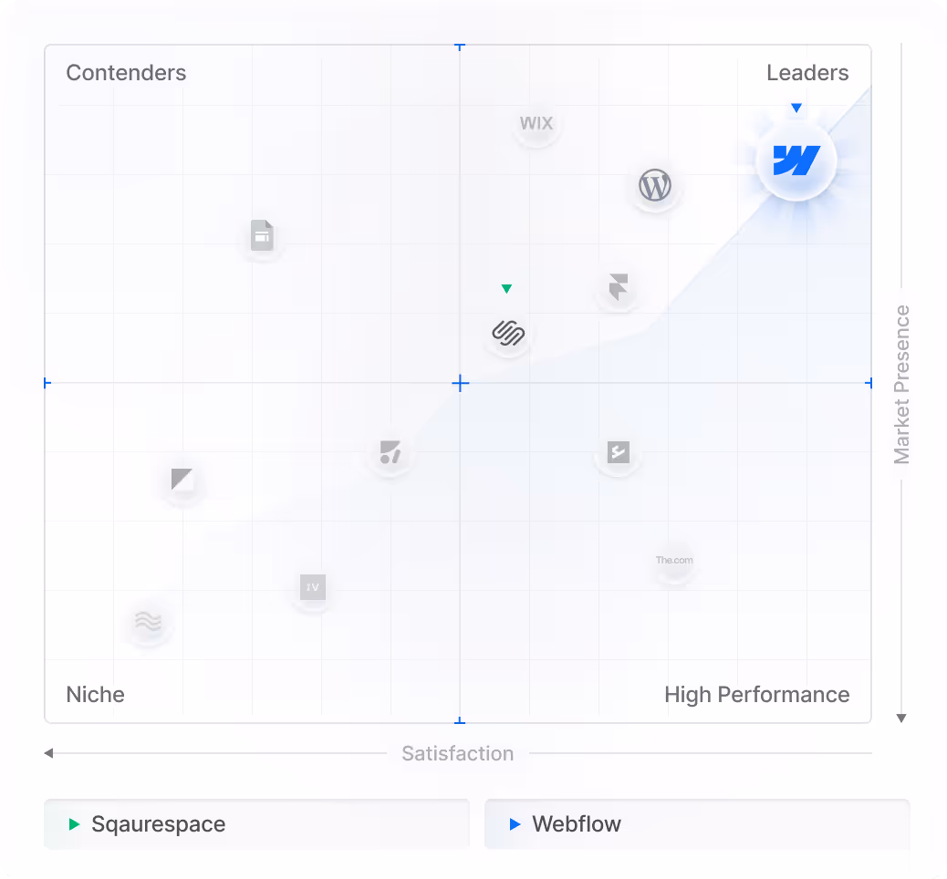Squarespace remains a leader but ranks slightly lower, showing it’s widely trusted yet trails Webflow in user experience and innovation.