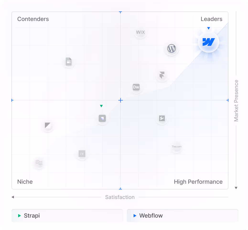 Strapi remains a leader but ranks slightly lower, showing it’s widely trusted yet trails Webflow in user experience and innovation.