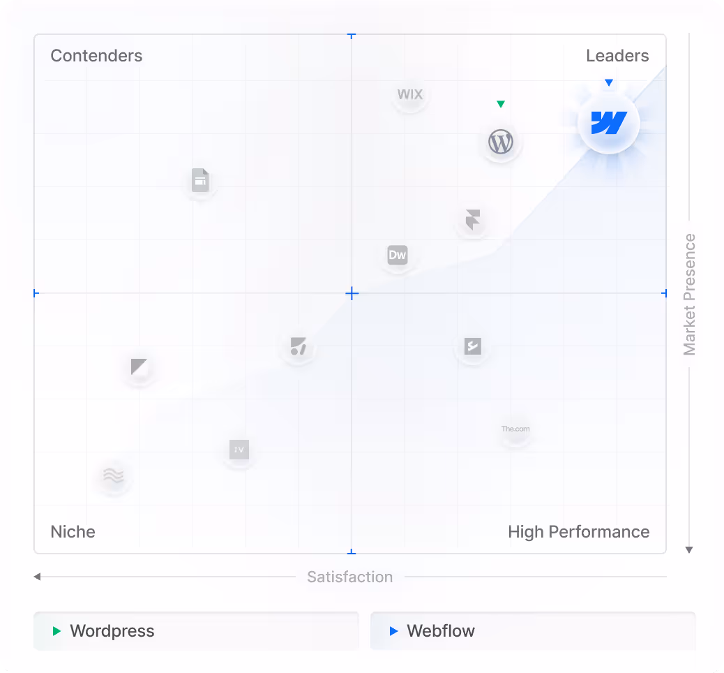 Webflow leads the chart with high satisfaction and strong market presence, reflecting its modern capabilities and design-focused experience.